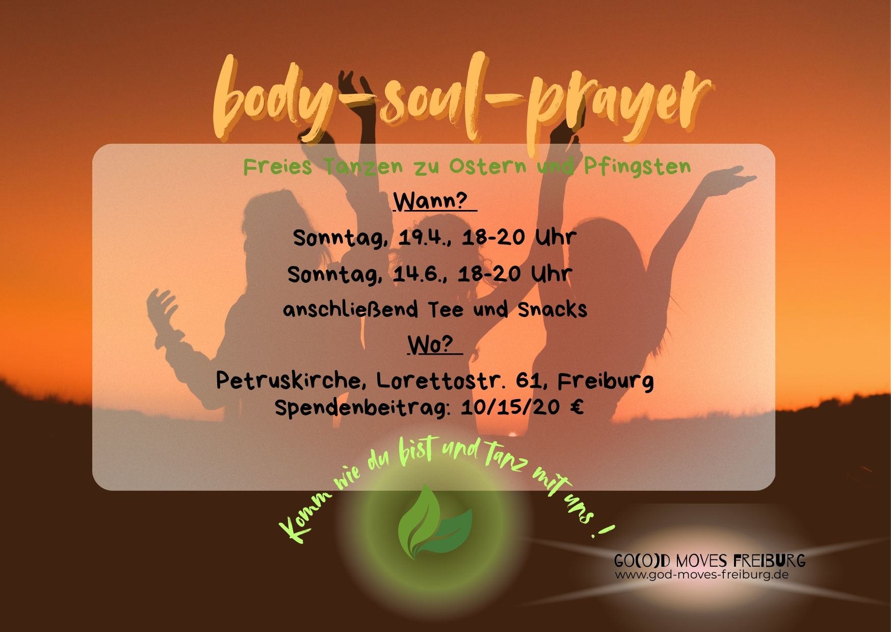 Du bist eingeladen, gemeinsam mit anderen in der Petruskirche mit deinem Körper und mit deiner Seele zu Musik zu tanzen und zu beten. Wir starten gemeinsam mit einem Körpergebet, dann beten und tanzen wir frei und verbunden mit Körper und Seele im Kirchenraum. Mit einem Segenskreis beschließen wir das body-soul-prayer. Anschließend Beisammensein bei Tee und Snacks. Bring gerne einen Snack mit!